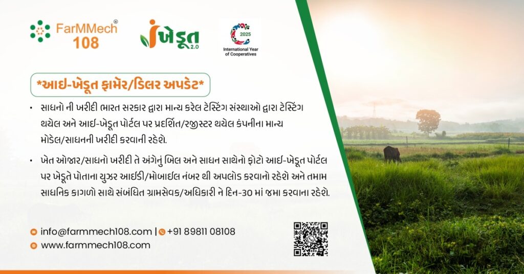 • સાધનો ની ખરીદી ભારત સરકાર દ્વારા માન્ય કરેલ ટેસ્ટિંગ સંસ્થાઓ દ્વારા ટેસ્ટિંગ થયેલ અને આઈ-ખેડૂત પોર્ટલ પર પ્રદર્શિત/રજીસ્ટર થયેલ કંપનીના માન્ય મોડેલ/સાધનની ખરીદી કરવાની રહેશે.